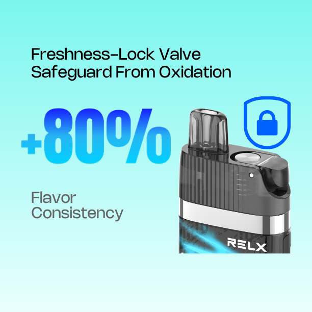 Inovasi Freshness-Lock Valve melindungi e-liquid Anda dari proses oksidasi. Teknologi ini memberikan peningkatan konsistensi rasa hingga +80%, memastikan kualitas rasa premium RELX yang sama dari isapan pertama hingga terakhir.
